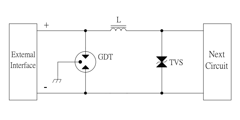An inductor L is used for coupling in the middle to drive GDT to discharge large currents