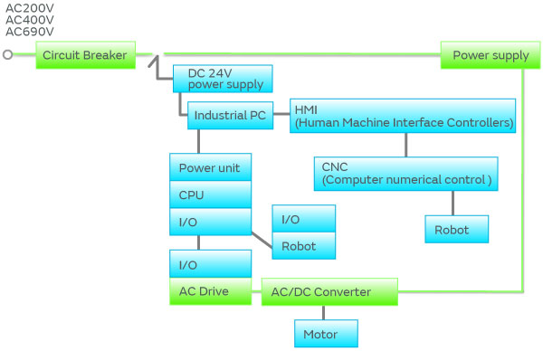 FA由PLC、变频驱动器、AC交流电机、各种电源等构成。