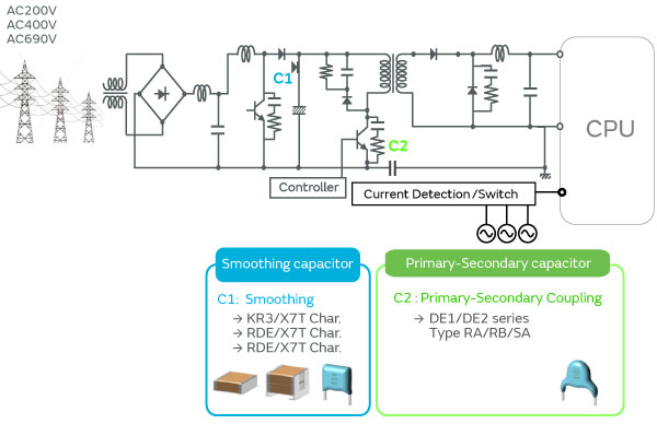 下面将介绍AC/DC,DC/DC变频器的使用电路示例、电感器使用电路示例和断路器用电源使用电路示例。