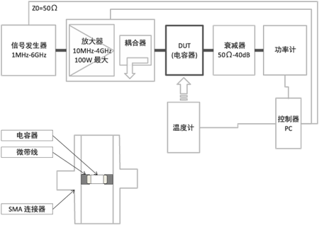 组成系统的设备及电缆类均统一为50Ω,将测量试料装在形成微带线的基板上,两端装有SMA连接器。用高频波放大器(Amplifier)增幅信号发生器(Signal GENERATOR)的信号,用定向耦合器(Coupler)观察反射同时即施加在试料(DUT)上。用衰减器(Attenuator)使通过试料输出的信号衰减,用电力计(Power Meter)观测。同时观测试料表面温度。