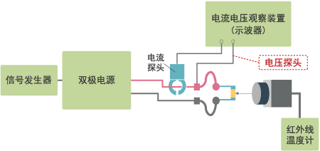 用双极電源将信号发生器的信号增幅,加在电容器上。用电流探头(通用探头)观察此时的电流,使用电压探头观察电容器的电压。同时用红外线温度计测量电容器表面的温度,明确电流、电压及表面温度上升的关系。